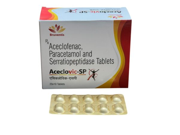 Home Tablets ACECLOVIC-SP ACECLOVIC-SP USES: Used for pain relief. PACKING: 20 x 10 COMPOSITION: Aceclofenac 100 mg + Paracetamol 325 mg + Serratiopeptidase 10 mg Category: Tablets Related products CARTIFLOW-DNTablets STOPINOR NTablets CITICELLTablets ACECLOVIC BENZTablets