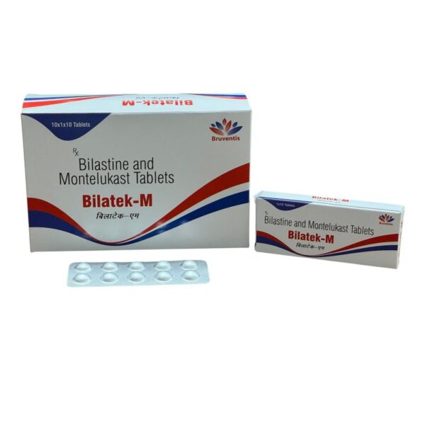 Home Tablets BILATEK-M BILATEK-M USES: Used in the treatment of Allergic conditions. PACKING: 10 x 1 x 10 COMPOSITION: Bilastine 20 mg + Montelukast 10 mg (ALU-ALU) Category: Tablets Related products STOPINOR NTablets DIENOZONETablets DELUXETINE 20Tablets COBARUSH CZSTablets