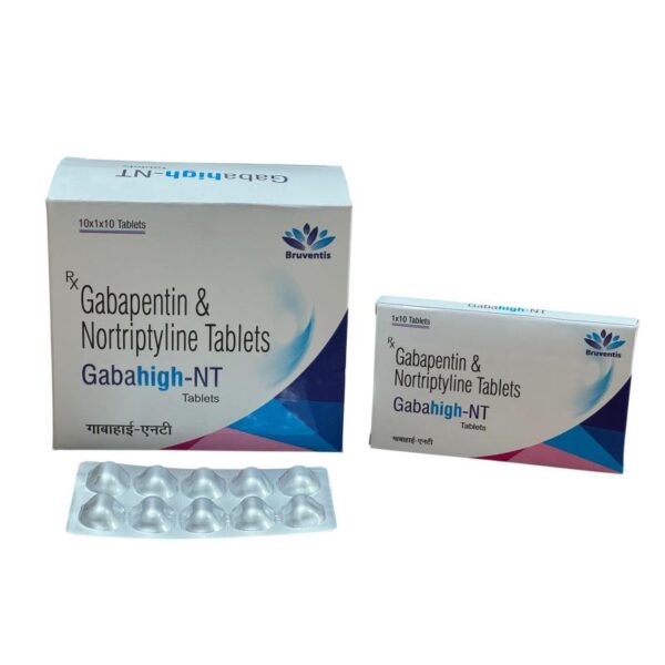 Home Tablets GABAHIGH-NT GABAHIGH-NT USES: Used in the treatment of neuropathic pain. PACKING: 10 x 1 x10 COMPOSITION: Gabapentin 300mg + Nortriptyline 10mg (ALU-ALU) (MONO WITH OUTER CARTON) Category: Tablets Related products B-METHYL 16Tablets CLOMIFEM 50Tablets MONTUVIS-ABTablets CARTIFLOW-DNTablets